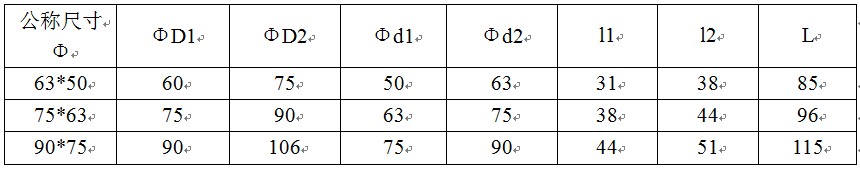 其中“ΦD1”表示管件小头公称外径,“Φd1”表示管件小头公称内径,“L”管件长度,“l1”表示管件小头承插口长度,“Φd2”表示管件大头公称内径,“ΦD2”管件大头公称外径,“l2”表示管件大头承插口长度,1.0Mpa=10公斤